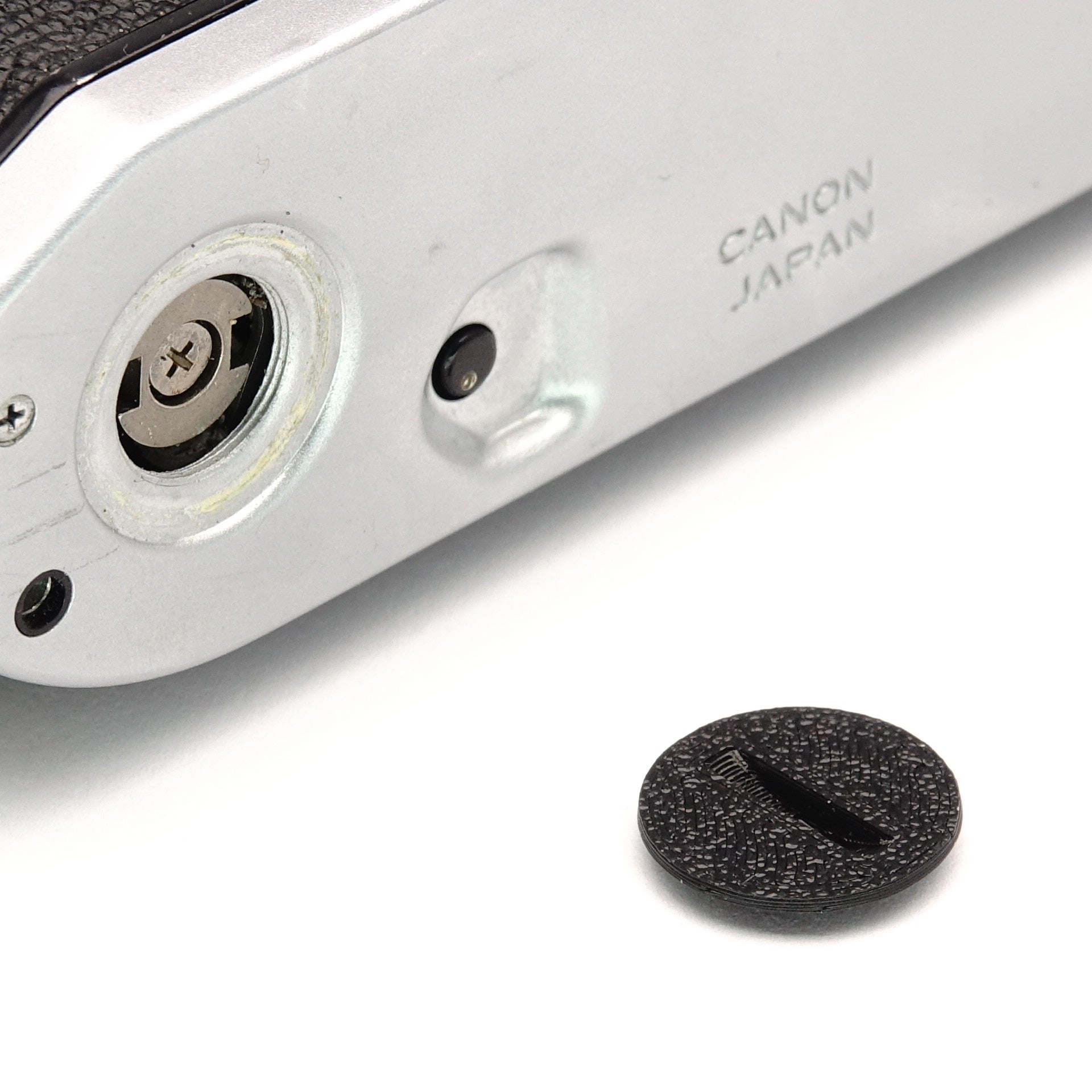 Ce cache remplace la pièce d'origine souvent perdue de la série Canon A. Il se visse dans le filetage au bas de l'appareil photo pour couvrir les connecteurs du Motor Drive (Winder) lorsqu'il n'est pas monté. Fabriqué en PLA+ robuste.