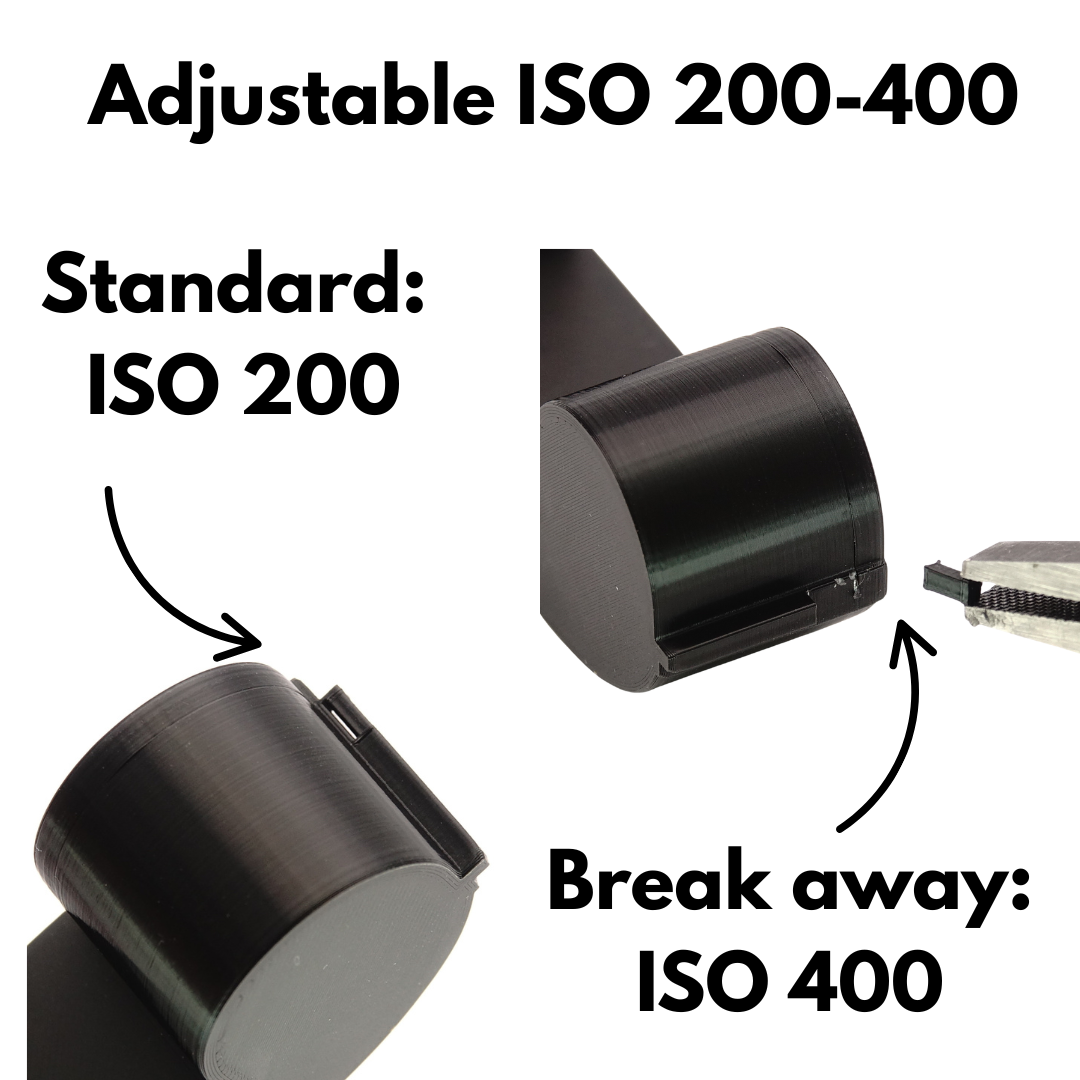 Cette cassette réutilisable te permet d’alimenter ta caméra 110 avec ton propre film. Elle est conçue pour être robuste et réutilisable plusieurs fois. Grâce à l’encoche ISO sur le côté, tu contrôles la sensibilité : avec l’encoche, la caméra reconnaît un film standard (environ ISO 200), si tu l’enlèves, elle passe en haute sensibilité (environ ISO 400).
